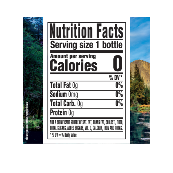 - Mountain spring water: zero calories, no sweeteners and no artificial colors or flavors
